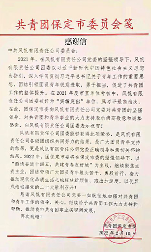 近日,中國(guó)船舶風(fēng)帆公司黨委收到共青團(tuán)保定市委發(fā)來感謝信,對(duì)公司團(tuán)委在2021年度市直單位考核中被評(píng)為最高檔次的“實(shí)績(jī)突出”單位表示祝賀,同時(shí)也向公司黨委對(duì)團(tuán)委的堅(jiān)強(qiáng)領(lǐng)導(dǎo)和親切關(guān)懷表示感謝。