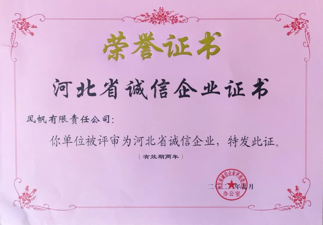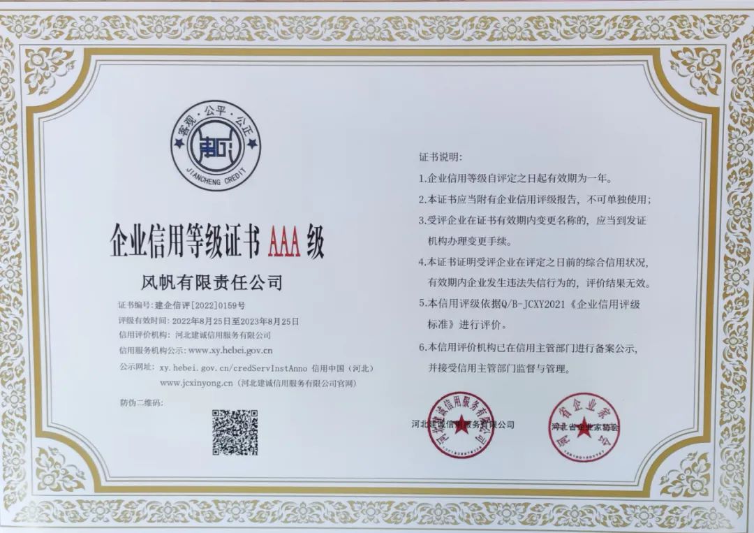 “河北省誠信企業(yè)”評價活動是在河北省社會信用體系建設(shè)領(lǐng)導(dǎo)小組的指導(dǎo)下,由河北省誠信企業(yè)評選委員會辦公室、河北省企業(yè)家協(xié)會會同省有關(guān)部門共同組織開展的。經(jīng)過企業(yè)申報、相關(guān)部門審查推薦、評選辦初審、省相關(guān)主管部門復(fù)審、評審專家委員會審核、第三方信用機構(gòu)信用評價、社會公示等程序,風(fēng)帆公司被確定為2022年度“河北省誠信企業(yè)”,并出具信用報告。